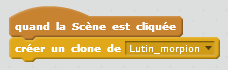 Jusqu'ici, nous avons manipulé un seul lutin. A présent, nous voulons en faire apparaître plusieurs en utilisant des clones. Un clone sera créé par la scène à chaque fois que l'on clique dessus.