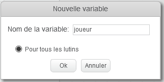 Dans la fenêtre qui s'ouvre, il faut donner le nom joueur à la variable puis cliquer sur le bouton Ok :