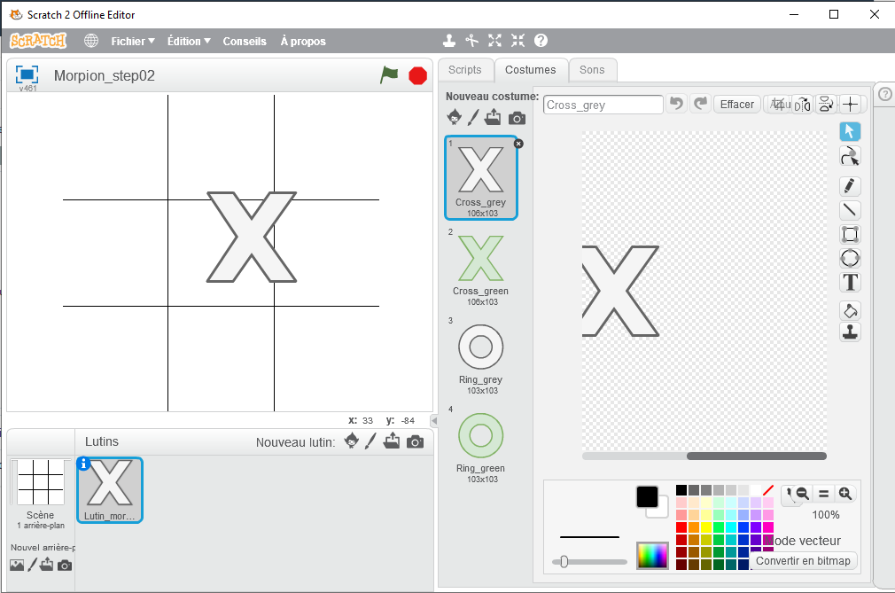 Maintenant que la grille s'affiche, l'objectif de cette étape est de créer le lutin qui pourra prendre la forme d'une croix on d'un cercle.
